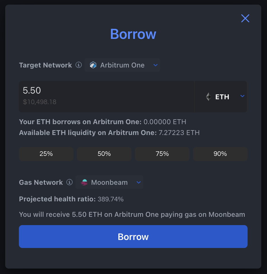After you’ve deposited collateral into Prime, you can now borrow against the value of your collateral. To initiate a borrow, head to the “Borrows” section of the dashboard. You can filter by asset and network to quickly find the asset you want to borrow from the protocol. Once you’ve located the asset you wish to borrow, click the borrow button. Enter in the amount you’d like to borrow or select the percentage you wish to borrow. You can use Universal Access by selecting a Gas Network to initiate your transaction on any chain if you wish. Click borrow and confirm your transaction to complete your borrow!